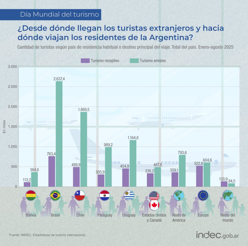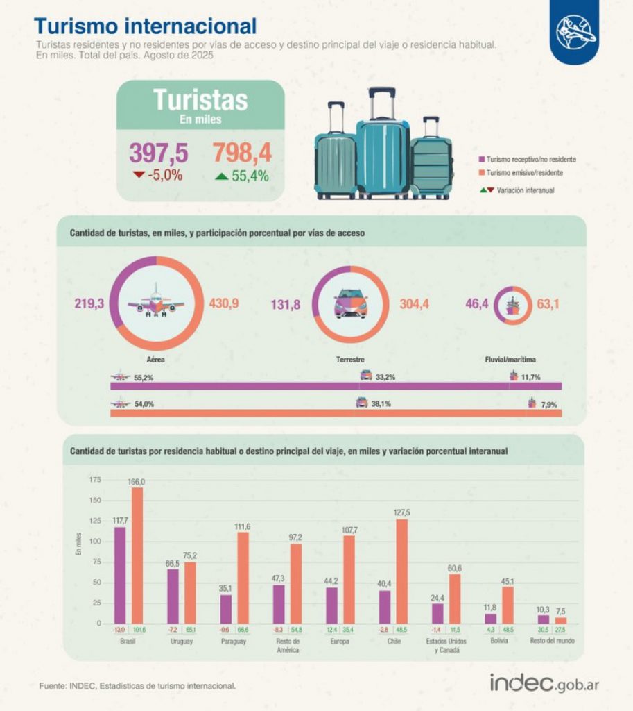 A propósito de turismo, hay números que hablan más fuerte que cualquier discurso. En agosto, según el último informe del Indec, 1,3 millones de argentinos hicieron las valijas y se fueron del país, mientras que apenas 664 mil extranjeros cruzaron nuestras fronteras para conocerlo. Resultado: saldo negativo de casi 700 mil visitantes. El turismo no está viniendo, está yéndose. El detalle duele en la caja: 798 mil turistas argentinos viajaron al exterior, mientras que sólo 397 mil turistas extranjeros vinieron a dejar sus dólares. El resto —excursionistas, que van o vienen sin pernoctar— también juega en contra: más salidas que entradas. En criollo, el turismo receptivo se enfría y el emisivo se recalienta. Y con él, se recalienta también la fuga de divisas. El operativo que releva estos datos se hace con la Dirección Nacional de Migraciones y abarca todos los aeropuertos internacionales. La estadística es aérea, pero el mensaje es terrenal: las salas de embarque están llenas, los hoteles de destino vacíos. Desde 2017, el Indec mide con lupa el ida y vuelta del turismo internacional. Y los últimos meses marcan tendencia: menos turistas extranjeros pisan suelo argentino, más argentinos deciden gastar su dinero en otros destinos y así el saldo de visitantes no para de caer. Y con él, también cae la ilusión de que el turismo pueda ser un motor rápido de ingreso de dólares.