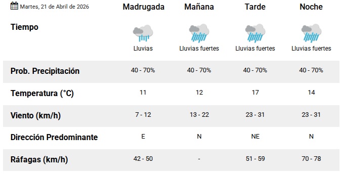 De esta manera, se pronostica una jornada en la que la lluvia será el principal denominador. La temperatura mínima será de 11° y la máxima llegará a 17° mientras que el viento será del sector norte y luego rotará al noreste.