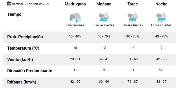 Un domingo pasado por agua, con viento que irá ganando en intensidad con el correr de las horas, y condiciones meteorológicas adversas que generaron alerta meteorológica tanto por lluvia como por viento. Las ráfagas nocturnas podrán alcanzar los 100 kilómetros por hora.